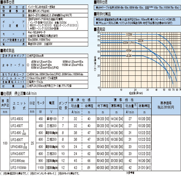 井戸ポンプ性能表 900w 200v使用