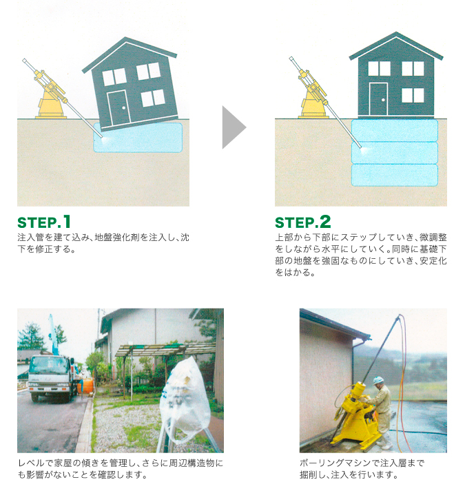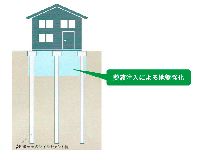 液状化等により傾いた家屋を、地盤内部に薬液を注入して修正する工法です。