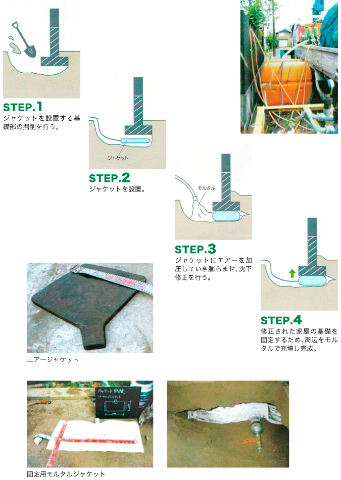 ジャケットをふくらませることにより、家屋を直接持ち上げて傾きを修正する工法です。
