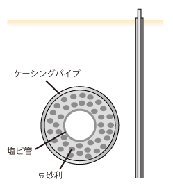 ケーシングパイプ内部に、ストレーナー(穴開き)加工を施した塩ビ管を挿入し、豆砂利をケーシングパイプと塩ビ管の隙間に投入します。豆砂利は不純物をろ過する役目をします。